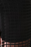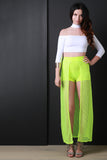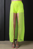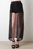 This maxi skirt features semi-sheer mesh, grid pattern, open front, and finished with stretch shorts. Accessories sold separately. Made in USA. 100% Polyester.