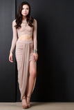 This stylish maxi skirt features a semi-sheer mesh fabric, ruched asymmetrical construction with front draping detail, elasticized waist band, and underlay mini skirt. Accessories sold separately. Made in U.S.A. 95% Polyester, 5% Spandex.