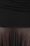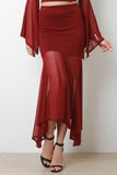 This maxi skirt features a soft knit fabrication with a contrast mesh lower half, elastic waistband, fit and flare silhouette, with an asymmetrical shark bite hem line. Accessories sold separately. Made in U.S.A. Self: 95% Rayon 5% Spandex, Contrast 95% Polyester 5% Spandex.