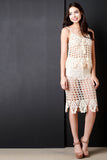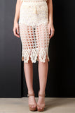 This daring midi skirt features a crochet knit construction, scalloped hemline, and elasticized waist band with self-tie lace detail. Accessories sold separately. 100% Acrylic.