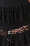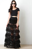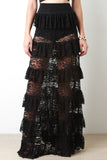 This maxi skirt featured a semi-sheer floral lace fabrication, contrasting wide high waisted band, and ruffle tiers design. Accessories sold separately. Made in U.S.A. 96% Polyester, 4% Spandex.