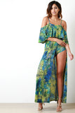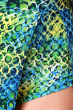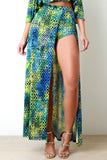 This maxi skirt features a smooth stretchy knit fabric, abstract circle print throughout, and elasticized waist band. Finished with a high vent front slit with boxer brief underlay. Made in U.S.A. 95% Polyester. 5% Spandex.