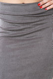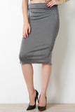This classy skirt features stretch ribbed fabric, wide waist panel, midi length, and back slit. Accessories sold separately. Made in USA. 65% Polyester, 30% Rayon, 5% Spandex.