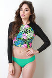 This swimwear rash guard cover-up top features a round neckline, long raglan sleeves, contrasting neon leopard and floral pattern print, crop hemline, open back with two self-tie closure bows. Accessories sold separately. 80% Nylon, 20% Spandex.