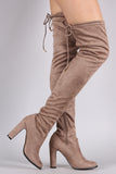 These over-the-knee boot s features a soft vegan suede, thick wrapped heel, round toe, and a drawstring collar that ties at the back for custom fit. Finished with a partial side zipper closure and cushioned insole for comfort.