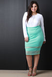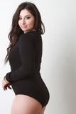 This plus size jersey knit bodysuit features a round neckline with a corset lace-up front, long sleeves, brief bottom, and a double snap button closure at crotch. Accessories sold separately. Made in U.S.A. 95% Cotton, 5% Spandex.