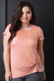 This plus size top features jersey knit fabrication, short sleeve construction and a round neckline. Finished with a twisted material design. Accessories sold separately. Made in U.S.A. 95% Rayon, 5% Spandex.