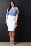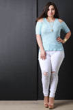 This plus size top features a round neckline, short sleeves with cold shoulder design and ribbed knit fabrication. Finished with a high low hemline and includes detachable necklace. Other accessories sold separately. Made in U.S.A. 48% Polyester, 48% Cotton, 4% Spandex.