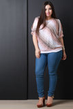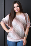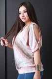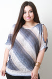 This top features a multi color stripe design with round collar, cold shoulder cutouts, mid length sleeves, and loose lightweight fabrication for every day wear. Accessories sold separately. Made in U.S.A. 78% Polyester 22% Rayon.