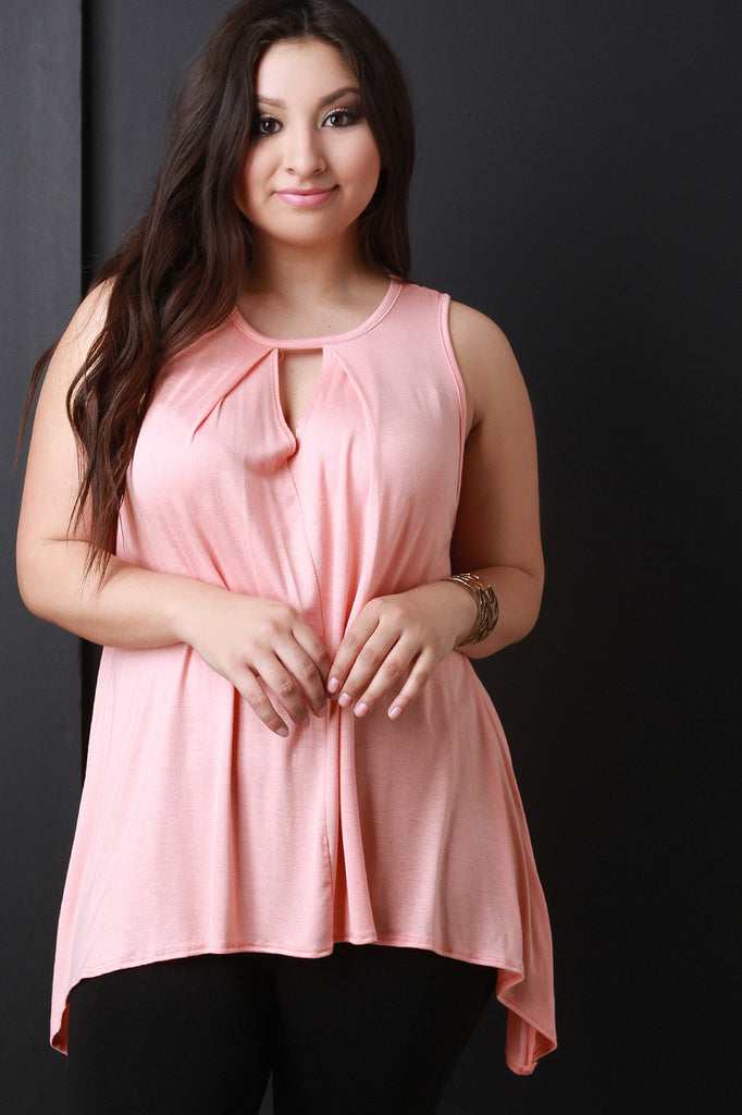 This simple yet beautiful top features a keyhole cutout design on bust. Includes a very loose and relaxed fit for everyday comfort. Finished with a handkerchief hemline. Accessories sold separately. Made in U.S.A. 95% Rayon, 5% Spandex.
