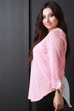 This plus size loose knit top features a round neckline, scoopback with razorback underlay and slight high low hemline. Finished with a gold button tab three-quarter sleeves and relax fit. Accessories sold separately. Made is U.S.A. Self: 89% Polyester, 7% Rayon, 4% Spandex. Contrast: 87% Polyester, 10% Rayon, 3% Spandex.