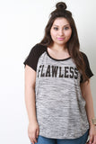 This plus size color block top features fine marl knit fabrication, round neckline, short sleeve construction , print that reads"FLAWLESS" and finished with a high low hemline. Accessories sold separately. 97% Rayon, 3% Spandex.