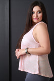 This striped accent, mock neck, sleeveless design, and high-low flare hemline. Accessories sold separately. Made in U.S.A. 75.8% Rayon, 18.2% Polyester, 3% Spandex.