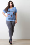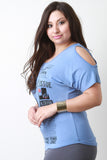 This plus size top features a fashion newsletter graphic print with rhinestone details, bat wing style, short sleeve with cold shoulder cut out, rounded neckline, and soft knit fabrication. Accessories sold separately. 97% Rayon, 3% Spandex.