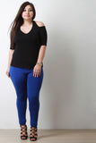 This cute top features a cols shoulder design, v neckline, halter straps, half sleeves, and a soft knit fabrication. Accessories sold separately. Made in U.S.A. 95% Rayon, 5% Spandex.