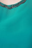 This plus size top features a woven knit fabrication, detailed round neckline with beads, sleeveless fit, and finished with an asymmetrical wrapped hemline. Accessories sold separately. 100% Polyester.