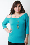 This plus size top has quarter sleeves with an off-the shoulder design on the right, featuring two shoulder straps. Flowy casual silhouette. Accessories sold separately. 95% Polyester. 5% Spandex.