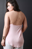 This cute plus size top features a v neckline, halter strap, removable gold tone chain triangle piece, rounded high low hemline, finished with a loose flowy fit. Accessories sold separately. Made in U.S.A. 96% Rayon, 4% Spandex.