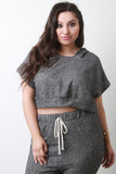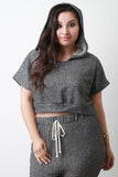 This plus size top features a heathered knit fabrication, round neckline with back hoodie, cap sleeves fit, and banded cropped hemline. Accessories sold separately. Made in U.S.A. 60% Cotton, 40% Polyester.