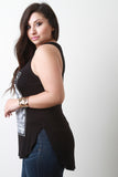 This plus size tank top features a scoop neckline, soft knit fabrication, rounded high low hemline, relaxed fit, and a graphic printed picture that says "Los Angeles California" with a picture of the city. Accessories sold separately. 97% Rayon 3% Spandex.