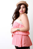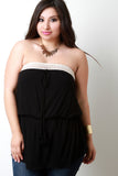 This plus size top features a woven knit fabrication, elasticized crochet trim tube neckline, selt-tie twisted drawstring tassel lace, and elasticized cinched midsection. Accessories sold separately. Made in U.S.A. Self: 100% Rayon. Lining: 100% Polyester.
