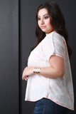 This plus size top features a knit fabrication , boxy loose fit, rounded neckline, stylized seams, and short dolman sleeves. Accessories sold separately. Made in U.S.A. 95% Polyester, 5% Spandex.