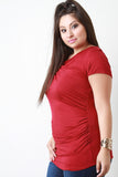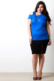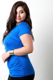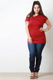 This plus size top features a soft knit fabrication, asymmetrical design with one cold shoulder, one gathered side seam. and an asymmetrical v neckline. Accessories sold separately. Made in U.S.A. 95% Rayon, 5% Spandex.