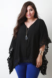 This plus size top features a v-neckline to a center pinch stitch design, kimono sleeves and crochet lace trimming. Accessories sold separately. 95% Rayon, 5% Polyester.