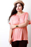 This plus size top features a boxy silhouette, round neckline, soft knit fabrication, lace inset sleeves, and a high low hem. Accessories sold separately.