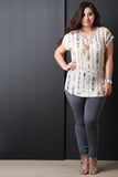 This plus size top features a loose knit with tribal prints, round neckline, short dolman sleeves, and curved hem. Includes layered chain/vegan suede necklace with feathers. Other accessories sold separately. Made in U.S.A. 88% Rayon, 12% Polyester.