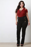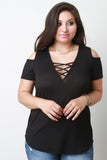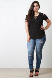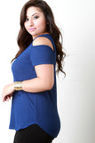 This breezy plus size top features a strappy v neckline, short sleeves with cold shoulder cutouts, and curved hem. Accessories sold separately. 96% Polyester, 4% Spandex.