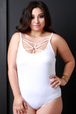 This plus size bodysuit features a sleeveless design, knit fabrication, scoop neckline, with a cage detail at neckline, finished with double snap closure at crotch. Accessories sold separately. Made in U.S.A. 95% Polyester, 5% Spandex.