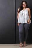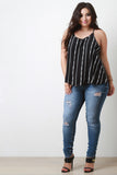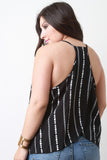 This plus size top features a woven fabrication with a geometric shaped in a stripe pattern, scoop neckline, spaghetti straps, racerback cut, and a overlapping open slit back, with a wide cut hemline. Accessories sold separately. 100% Rayon.