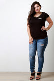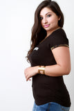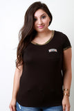 This plus size t-shirt features a soft jersey knit fabrication, camo print-trimmed, front pocket with the "ARMY" patch, rounded neckline, and short sleeves fit. Accessories sold separately. Made in U.S.A. 97% Rayon, 3% Spandex.