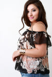 This plus size top features a floral printed chiffon fabrication, cold shoulder construction with thin adjustable straps, and elasticized ruffled neckline. Finished with a slightly rounded hemline. Accessories sold separately. Made in U.S.A. 100% Polyester.