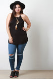 This plus size soft knit top is trapeze silhouette, featuring a ribbed design with a curved high slits hemline. Flare cut. Unlined. Sleeveless with a round neckline. Top includes feather necklace, other accessories sold separately. 95% Rayon. 5% Spandex,