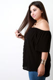 This plus size top features a lightweight woven fabric, off the shoulder neckline, front crochet lace leaves panel design, and elbow sleeves fit. Finished with a rounded hemline. Accessories sold separately. Made in U.S.A. 100% Rayon.