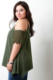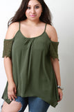 This stylish plus size top features a textured woven fabric, cold shoulder design, short crochet lace sleeves, scoop neckline, gather details and shark-bite hemline. Accessories sold separately. Made in U.S.A. 100% Polyester.
