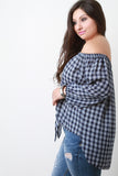 This plus size top features plaid print, elasticized off the shoulder neckline, long bishop sleeves, self-tie front, and high-low hem. Accessories sold separately. Made in USA. 100% Polyester.