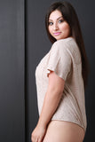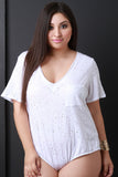 This plus size bodysuit features distressed jersey knit, deep v-neckline, short sleeves, left breast pocket, and snap button closure at crotch for easy on/off. Accessories sold separately. Made in USA. 100% Cotton.