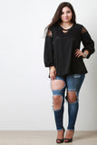 This plus size top features textured fabric, contrast semi-sheer floral lace panel, round neckline, keyhole cutout, and long bishop sleeves. Accessories sold separately. 100% Polyester.