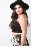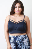 This plus size crop top features smooth stretch fabric, caged strappy design, and spaghetti straps. Accessories sold separately. Made in USA. 92% Polyester, 8% Spandex.