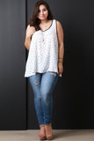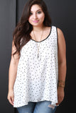 This top features contrasting stars prints, round neckline, v-back with a secure strap at nape, A-line cut, and sleeveless construction. Accessories sold separately. Made in U.S.A. 100% Polyester.