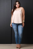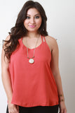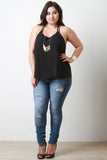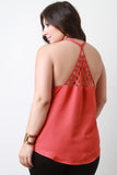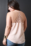 This plus size top features scoop neckline, double spaghetti straps, strappy caged triangle back. Accessories sold separately. 100% Rayon.