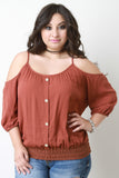This plus size top features a scooped neckline with a cold shoulder design and elasticized ends short sleeves. Textured woven knit. Decor buttons along the front. Finished with an elasticized crochet lace hemline. Accessories sold separately. 100% Rayon.
