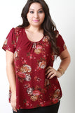 This plus size top features a lightweight chiffon fabrication vintage inspired floral print, rounded neckline, gathered detail at neckline and sleeve, back keyhole and a wide cut hemline. Accessories sold separately. 100% Polyester.