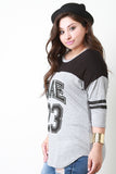 This plus size graphic print tee features a soft knit fabrication, contrast black yoke, "Bae 23" graphic print, half sleeves with double stripes printed on each sleeve, rounded neckline, relaxed fit, and a rounded hemline. Accessories sold stately. 97% Viscose 3% Spandex.