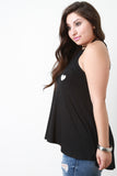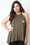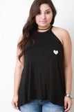 This plus size tank top features a mock neck, soft knit fabrication, sleeveless design, wide cut hem for a flowing fit, and a chest pocket with a heart screen print. Accessories sold separately, 97% Rayon, 3% Spandex.