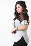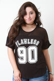 This plus size tee features a soft knit fabrication with contrast mesh yoke, "Flawless 90" graphic print, short sleeves, rounded neckline, with a rounded hemline and a fitted silhouette. Accessories sold separately, 97% Rayon, 3% Spandex. Contrast: 90% Nylon, 10% Spandex.