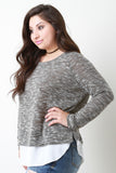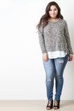 This plus size sweater features a marled knit fabrication, rounded neckline, long sleeves, relaxed fit, and a contrast hem for faux button up layered appearance. Accessories sold separately. Made in U.S.A. 53% Polyester, 43% Rayon, 4% Spandex Contrast 100% Polyester.